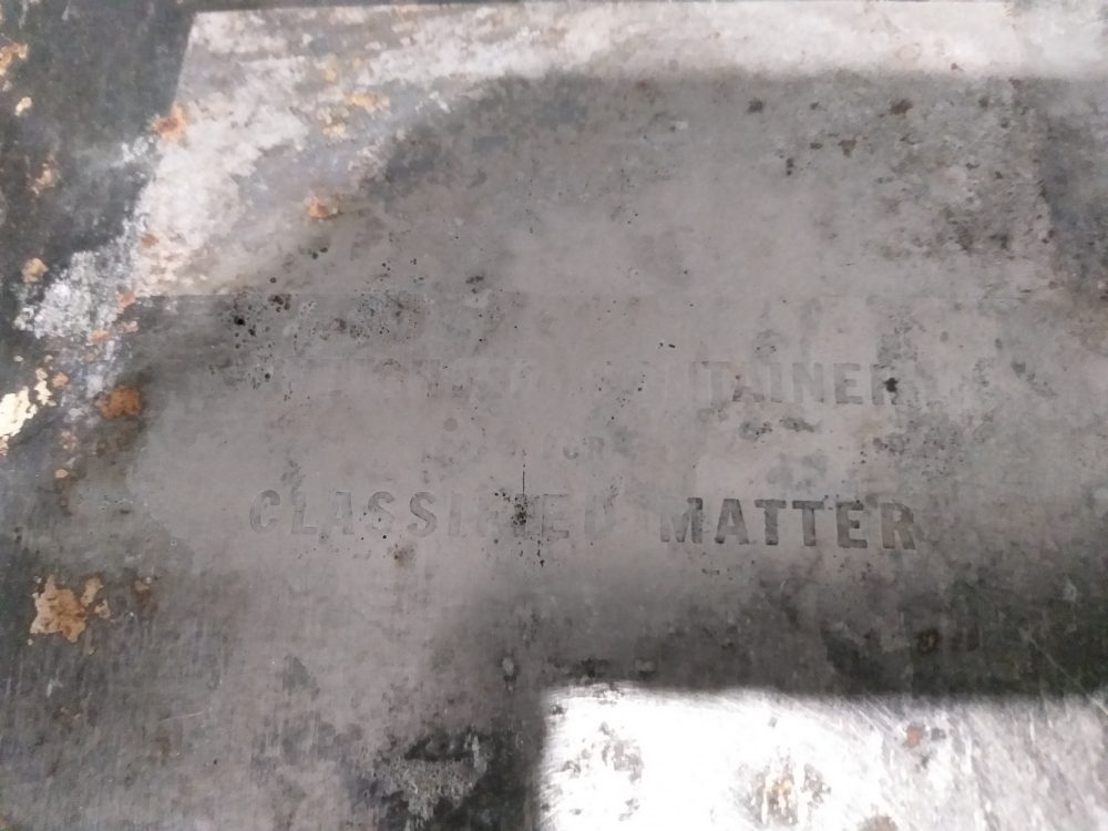 The engraving reads “Weighted Container for Classified Matter” (see below)