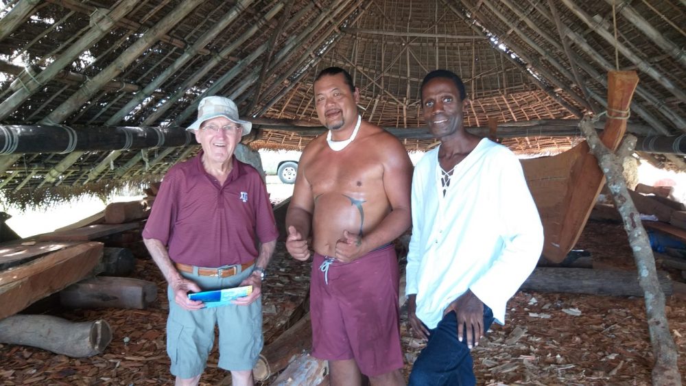 Alex Dunn, former United Airlines pilot of 32 years and one-time pilot of the lone, operational B-29 used by the Commemorative Air Force for traveling air shows, recently visited Saipan for DiscoverSaipan.com‘s World War II Pilgrimage tour. Dunn is seen here with John S. Castro-Mames, project coordinator of the Seafaring Traditions Program in Susupe along with author/guide Walt F.J. Goodridge.(Photo: Tyler Warwick)
