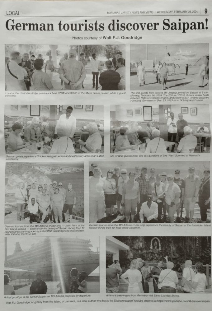 In case you didn’t know, the empire of Germany actually had possession of these islands for 15 years from 1899 to 1914, and there is still some of that influence (names, language, etc.) within the local community. Well, “the Germans” have returned! A fun-loving, cool group of folks visiting on the cruise ship MS Artania from out of Hamburg! Join me on a wunderschön (beautiful) day on Saipan: