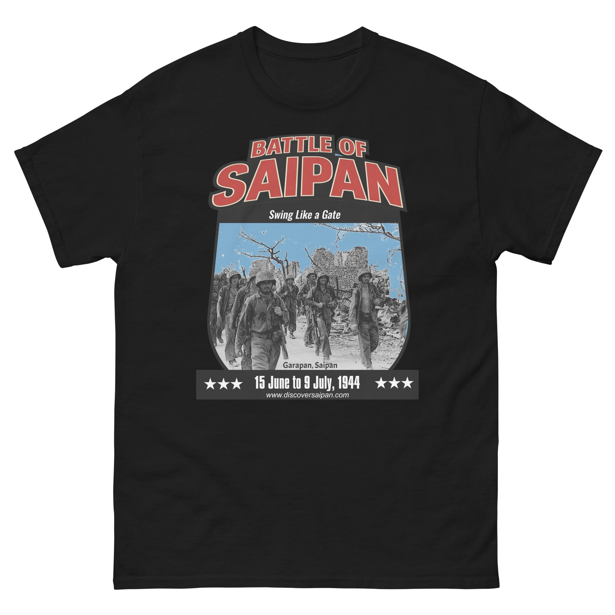 Relive a pivotal WWII campaign with the Battle of Saipan design from the Hell in the Pacific™ series. This artwork captures weary U.S. Marines advancing through the ruins of Garapan after securing the island. Featuring the rallying phrase “Swing Like a Gate,” this piece commemorates the fierce urban combat and strategic victory that shaped the Pacific war.